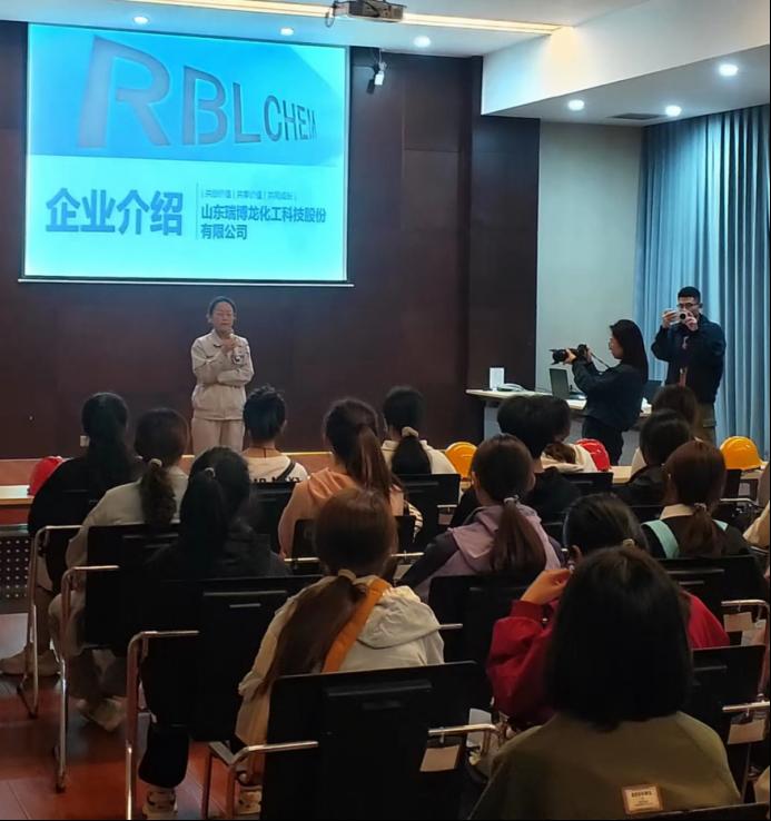 在山东瑞博龙化工有限公司,抵达公司后,公司人力资源部经理周明丽对同学们的到来表示热烈欢迎,公司分析检测实验室主任、研发实验室主任、车间主任围绕公司生产、研发、工艺流程做详细讲解。随后在公司技术负责人的陪同下同学们前往各个实习岗位,开始实习。
