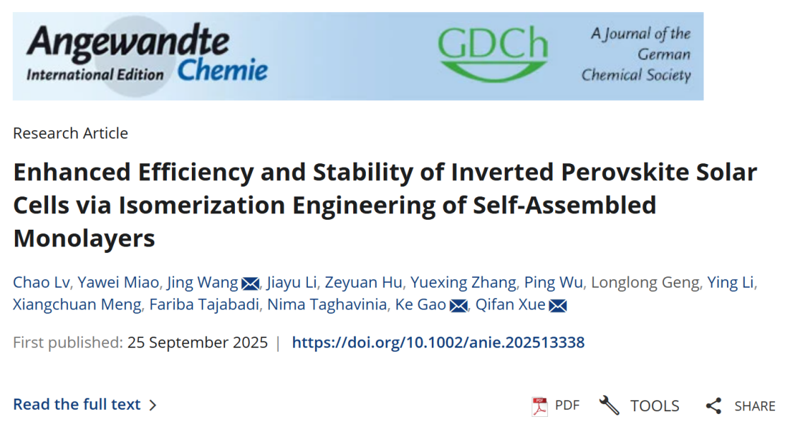 近日,公司化学与化工公司吕超副教授及其合作团队在化学领域国际顶级期刊 《Angewandte Chemie International Edition》 (影响因子16.9,中科院一区top)上发表题为“Enhanced Efficiency and Stability of Inverted Perovskite Solar Cells via Isomerization Engineering of Self-Assembled Monolayers”的最新研究成果。该工作是古天乐代言太阳集团以第一单位在Angewandte Chemie International Edition上发表的首篇论文。
