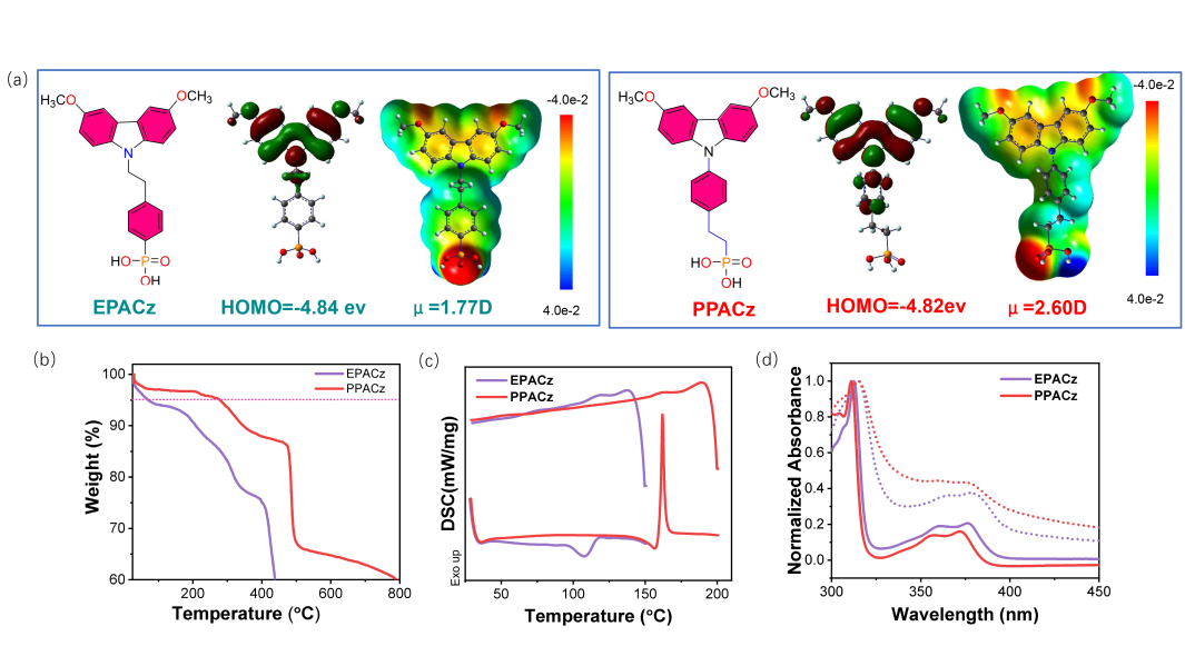 该研究团队首次通过异构化分子设计策略,实现了自组装单分子层(Self-Assembled Monolayers, SAMs)在倒置钙钛矿太阳能电池中的性能重大提升。研究团队通过对比合成的两种异构化咔唑类分子(EPACz 与 PPACz),发现 PPACz 具有更高的分子偶极矩、更优的能级匹配和更致密的界面组装结构。
