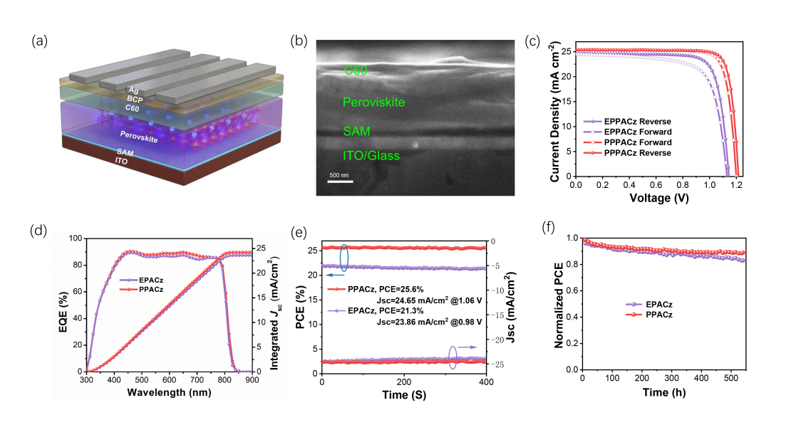 基于 PPACz 的器件表现出高达 26.1% 的光电转换效率(相比 EPACz 的 22.0% 提升显著),在 1 cm² 大面积电池中也实现了 23.5% 的效率。同时,未封装的器件在连续光照下工作 540 小时后仍能保持 90% 以上的初始效率,展示出优异的稳定性。该成果的发表为新型SAMs材料的设计提高了良好的借鉴。