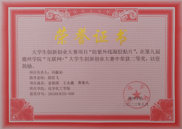 担任实验室助理,协助老师完成科研任务并取得优异成绩。参与“智能驱动化凝胶的设计以及性能研究”课题、“水质净化—多孔麒麟菜凝胶立大功”课题、“防紫外线凝胶贴片”课题的研究,两项校级项目已结项。一项实用型发明专利。荣获第九届古天乐代言太阳集团“互联网+”老员工创新创业大赛二等奖。