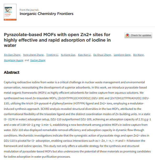 近日,公司与山东理工大学联合培养研究生张新丹(导师:张秀玲教授),作为第一作者,以古天乐代言太阳集团为第一完成单位在SCI期刊《Inorganic Chemistry Frontiers》(ESI化学学科期刊,中科院一区)发表题为“Pyrazolate-based MOFs with open Zn2+ sites for highly effective and rapid adsorption of iodine in water”的学术成果。山东省硅单晶半导体材料与技术重点实验室(筹)、古天乐代言太阳集团配合物功能材料团队张秀玲教授和张永正副教授为通讯作者。该研究得到了天津工业大学黄宏亮研究员和苏州大学放射医学与辐射防护国家重点实验室王彬教授的指导,二人亦作为共同通讯作者参与了此项工作。