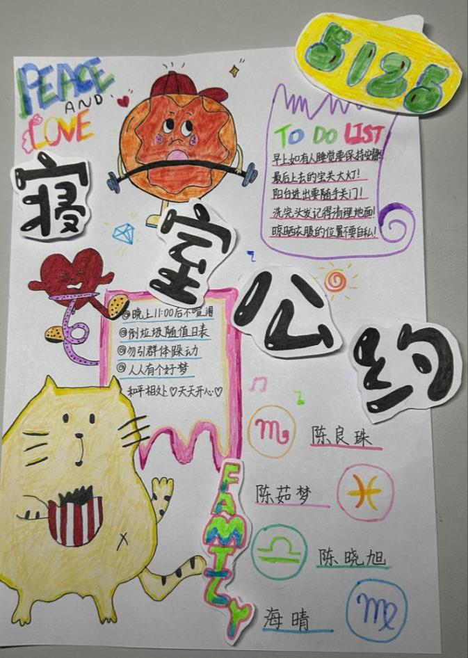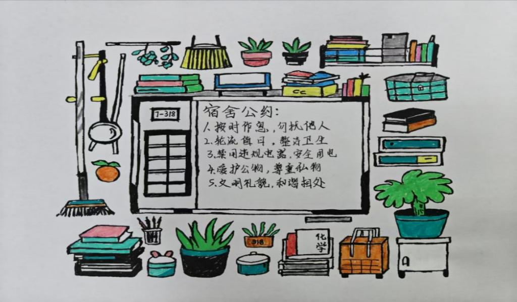 活动期间,同学们积极响应,他们紧扣宿舍生活的点点滴滴,用心草拟公约,涵盖作息、卫生、物品管理、用电安全与人际相处等方面。为了凸显宿舍特色,他们巧妙融入动漫、诗词、书法等元素,赋予 A4 尺寸的作品鲜活生命力,皆凝聚着对和谐宿舍的炽热期待,满溢青春智慧与活力。