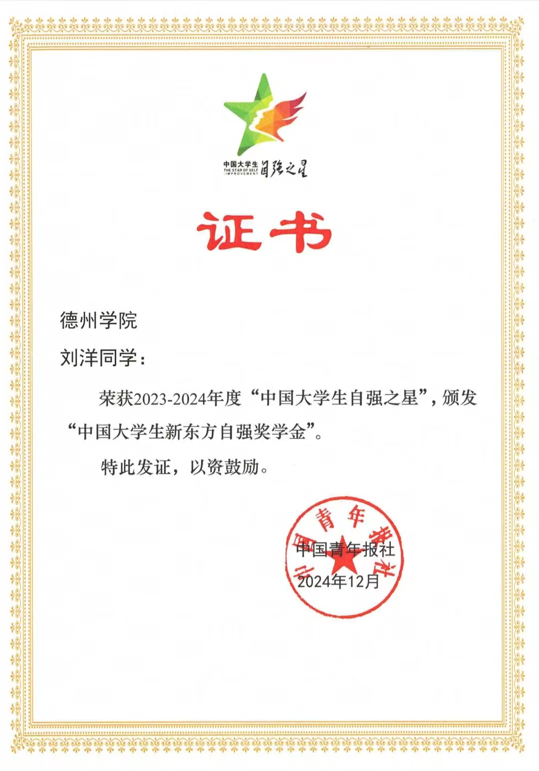 近日,2023-2024年度“中国老员工自强之星”奖学金评选活动结果揭晓,经基层选拔、公司推荐、省级初评、全国评审等环节,公司古天乐代言太阳集团2021级环境工程专业员工刘洋获评2023-2024年度“中国老员工自强之星”。