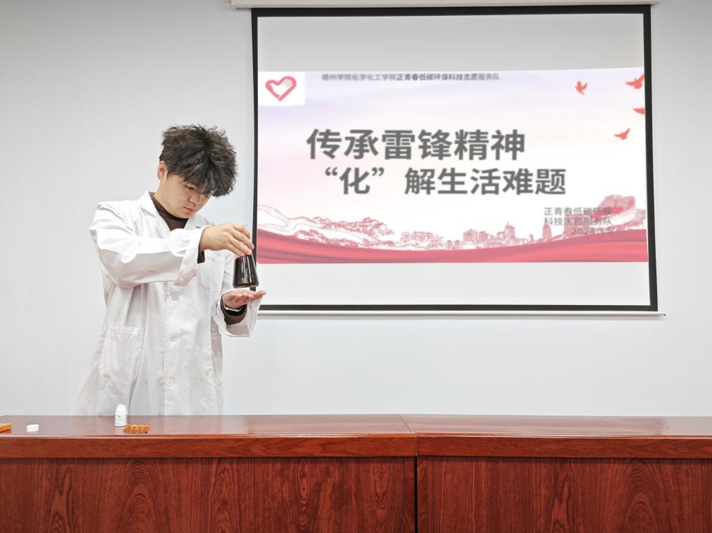活动伊始,志愿者们围绕雷锋同志的奉献精神与助人为乐事迹展开讲述,带领参与者深刻感悟雷锋精神的内涵。在互动环节,志愿者们借助高锰酸钾与维生素C的氧化还原反应,生动地诠释了奉献精神。当紫红色的高锰酸钾溶液接触到维生素C后,溶液逐渐褪色,直至变为无色透明。志愿者们巧妙地将化学反应中的电子转移与雷锋精神的传承相联系,向大家解释道:“电子的转移就如同爱心的传递,雷锋精神恰似那活跃的电子,在人与人之间不断流动,照亮他人,温暖社会。”随后,志愿者们结合日常生活场景,科普氧化还原知识,分享了如用维生素C去除茶渍、清洗衣物等实用技巧。