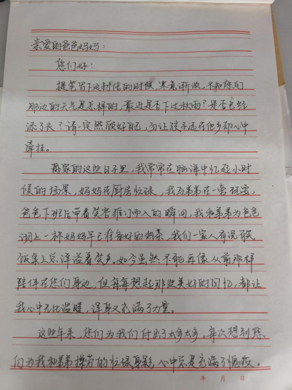 秋阳正好,各色菊花竞相绽放,处处洋溢着温馨祥和的氛围。有的同学为长辈书写温暖的家书,虽然字体不一样,但传递的情感是相同的,那就是祝福长辈身体康健。有的同学是为长辈做一件事,事情可大可小,但表达的意思是相同的,那就是对长辈的感恩。
