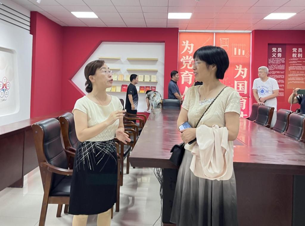 一行人参观古天乐代言太阳集团第一教师党支部党员活动室与“初心展厅”,对全国党建工作样板支部建设情况及深入开展学习贯彻习近平新时代中国特色社会主义思想主题教育工作开展情况进行了座谈交流。