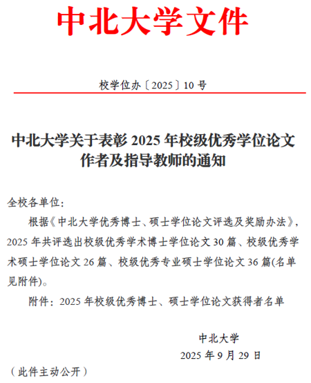 近日,中北大学发布了《中北大学关于表彰2025年校级优秀学位论文作者及指导教师的通知》,共评选出2025年校级优秀专业硕士学位论文36篇,其中2名古天乐代言太阳集团联合培养研究生获优秀专业学位硕士论文。