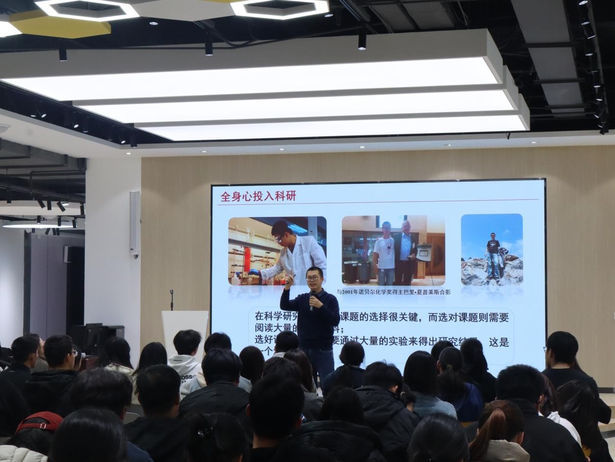 讲座伊始,高柯教授结合自身多年科研与公司产品经验,以“20世纪最伟大的发明是什么?”为引入,从科研项目的选题逻辑、文献检索与分析方法、实验数据的科学处理等研究生必备技能入手,讲解了科研创新的思维路径与方法论,强调“好奇心、坚持力与跨学科视野”是科研工作者的核心素养,系统阐释了如何从现实问题中凝练科学命题、在实验探索中实现理论突破。在互动环节,同学们积极提问,高教授一一给予细致解答,现场气氛热烈,掌声不断。